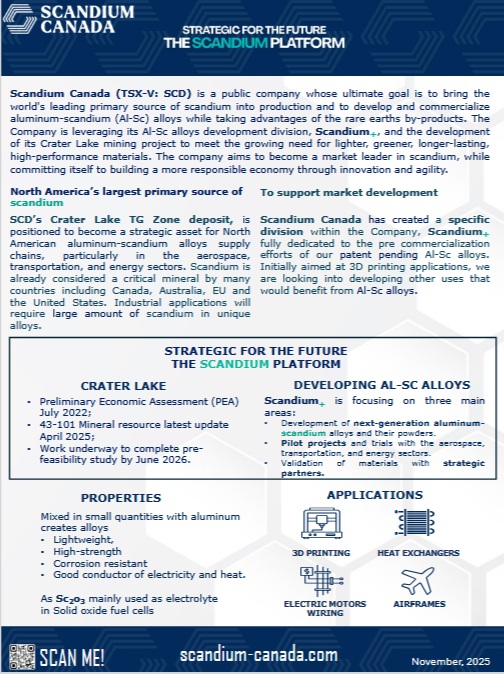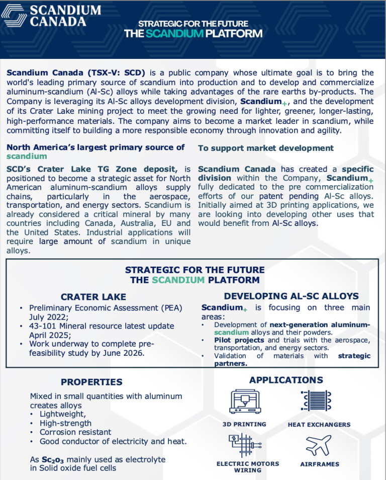 Scandium Canada Ltd. is currently developing the North America’s largest primary source of scandium, with the aim of contributing to global efforts toward reducing carbon emissions.