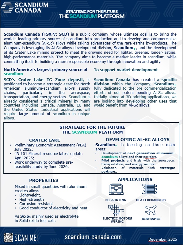 Investors Stock Information Toronto Stock Exchange in real time : Scandium Canada Stock and Shares Corporate Presentation and Fact Sheet Learn more about Scandium Canada in our About page News Releases Financial Reports Regulatory Filings